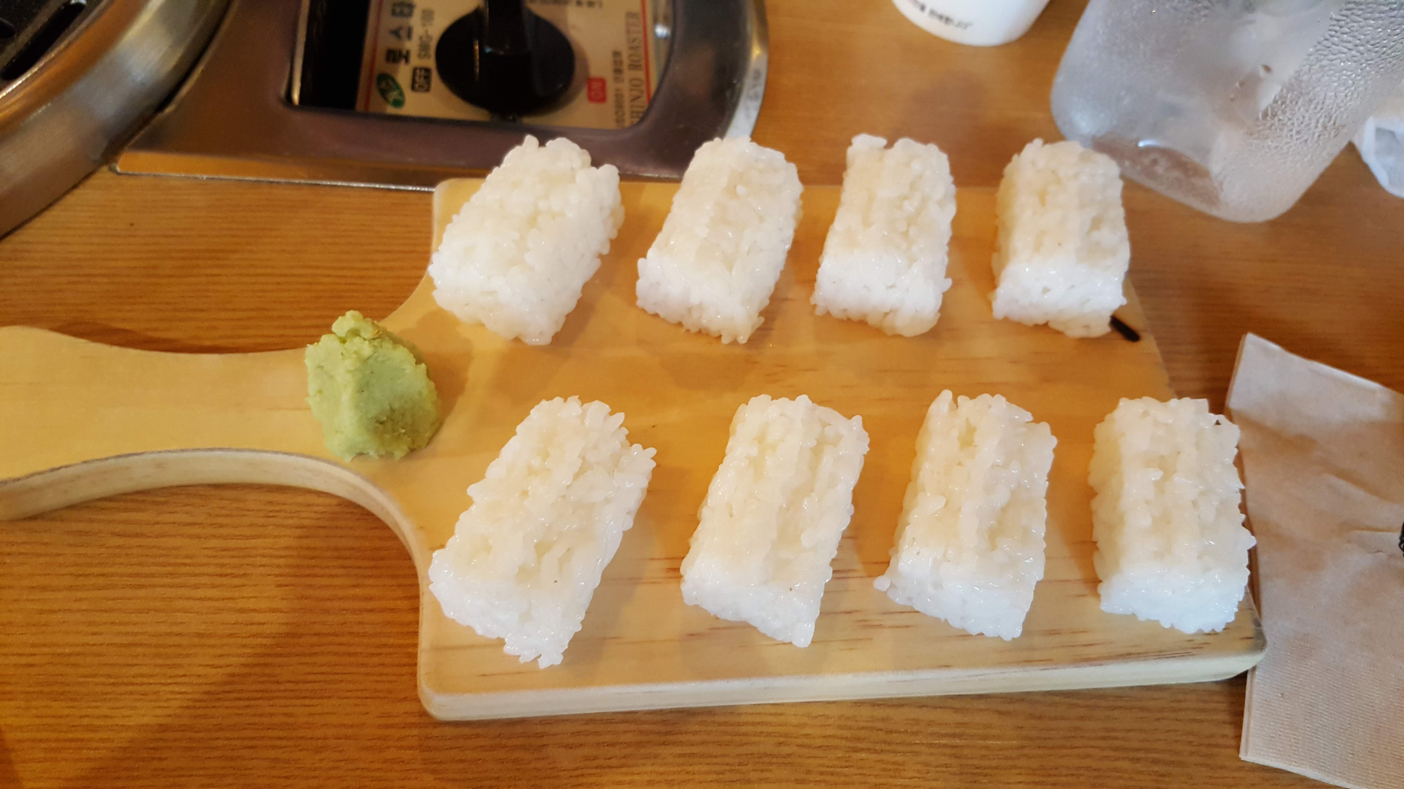 사이드 메뉴로 나오는 초밥에 와사비를 놓고 차돌박이를 올려 초밥처럼 먹는데,