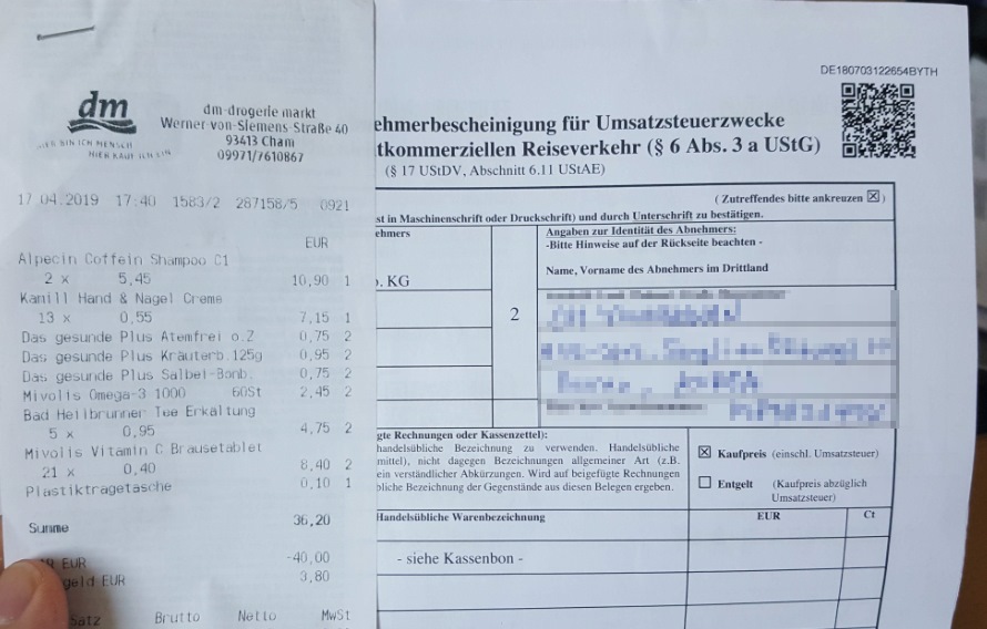 --> dm에서 구입/텍스프리 신청서 작성 --> 독일 재입국후에 구입했던 dm에서 세금환급