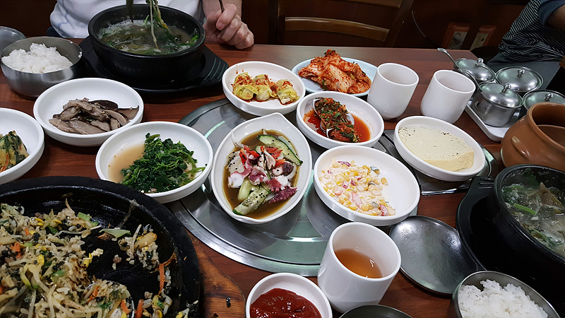기본으로 깔리는 반찬은, 나물, 버섯무침, 옥수수 샐러드, 꼬막무침, 두부김치 롤(두부를 김치로 롤 모양으로 감싼 것),