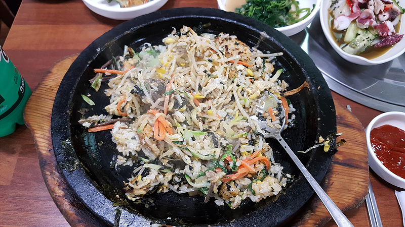 돌솥비빔밥은 특이하게 뚝배기가 아니라 커다란 원반 모양인데 돌을 제대로 달궈서 내왔다.