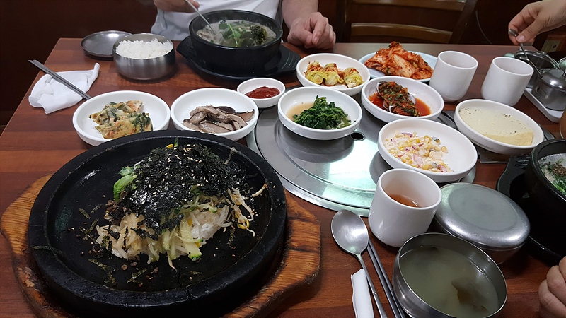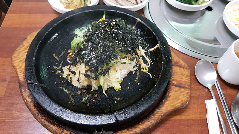 돌솥비빔밥은 특이하게 뚝배기가 아니라 커다란 원반 모양인데 돌을 제대로 달궈서 내왔다.