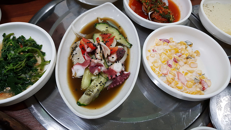 기본으로 깔리는 반찬은, 나물, 버섯무침, 옥수수 샐러드, 꼬막무침, 두부김치 롤(두부를 김치로 롤 모양으로 감싼 것),