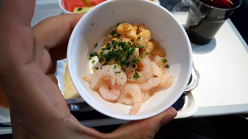 새우 샐러드, 과일, 김치, 고추장, 빵, 그리고 메인이 소고기.