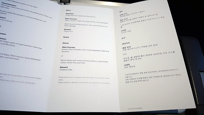 사실 루프트한자의 기내식이 개인적으로 그다지 좋아하지 않아서 대충 훑어보고 말았다.