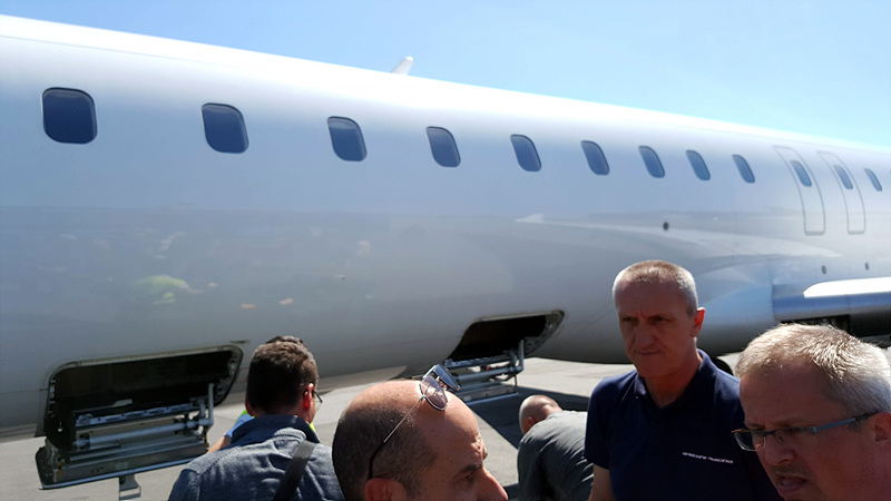 기체가 작아서 일반 연결부와 맞지 않아 버스를 타고 활주로까지 가야 한다.