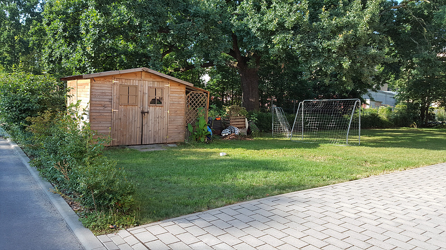 호텔 뒷편 주택가의 잔디밭과 작은 창고.