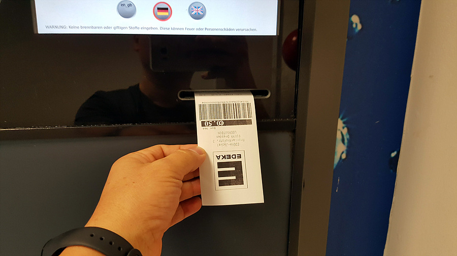 녹색 버튼 Pfandbon을 누르면 아래와 같이 금액이 적힌 전표가 나온다.