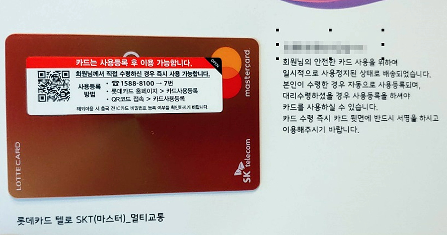 보통 카드 전면에 카드번호가 양각되어있는데 이 카드는 전면에 카드 이름 통신사, 마스터카드 표시만 있고 심플하다.