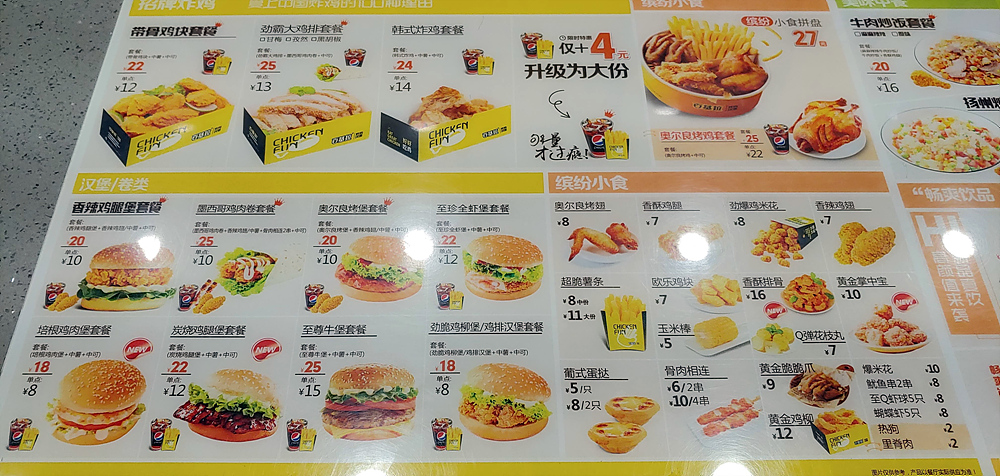 맥도널드나 KFC와 거의 비슷한 메뉴 구성인데 치킨이 많은 걸로 봐서 KFC와 유사한 것 같다.
