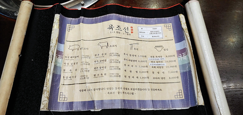메뉴가 특이하게 두루마리 형식이다... 옛날 조선시대 왕의 장계를 보는 듯하다.ㅎ