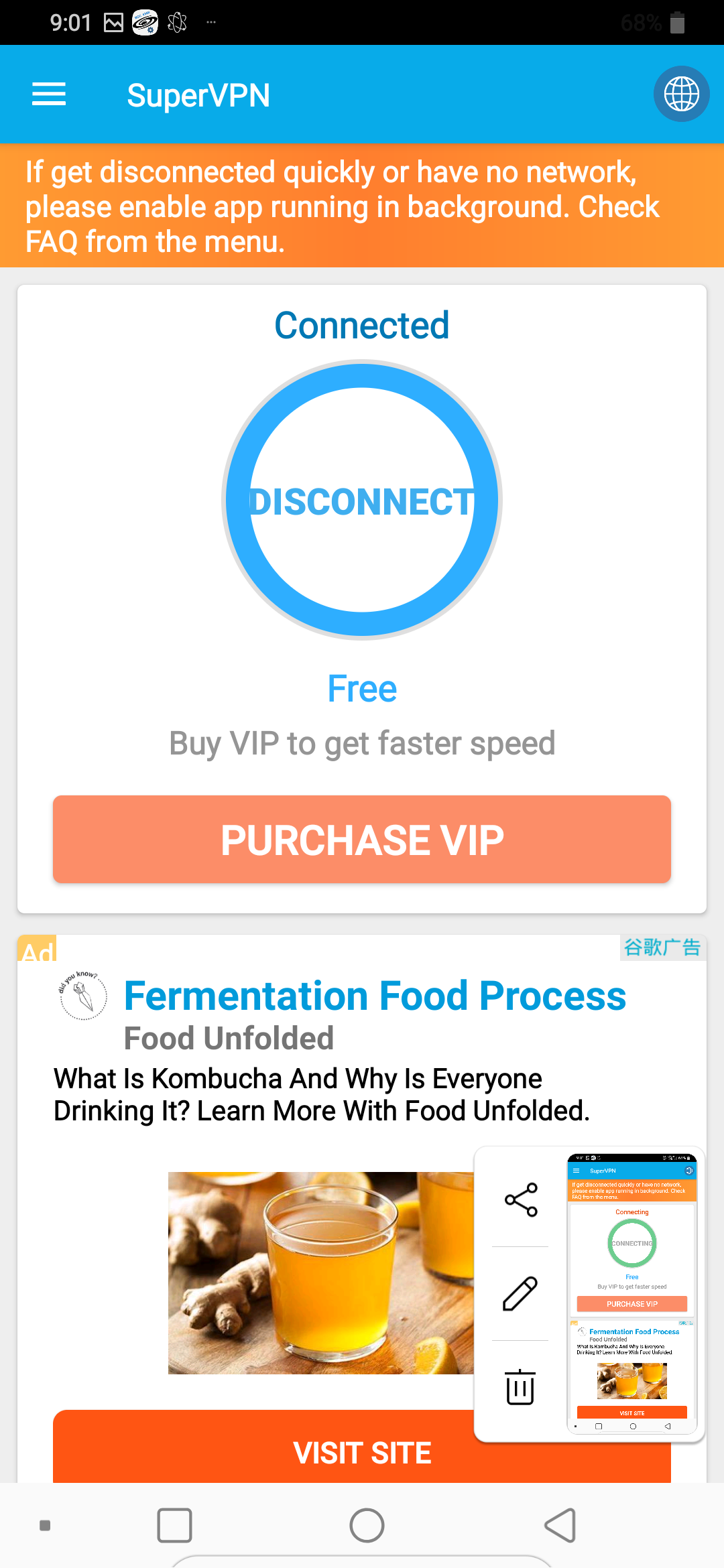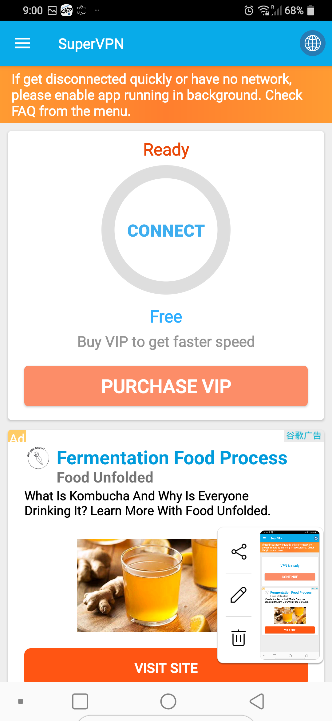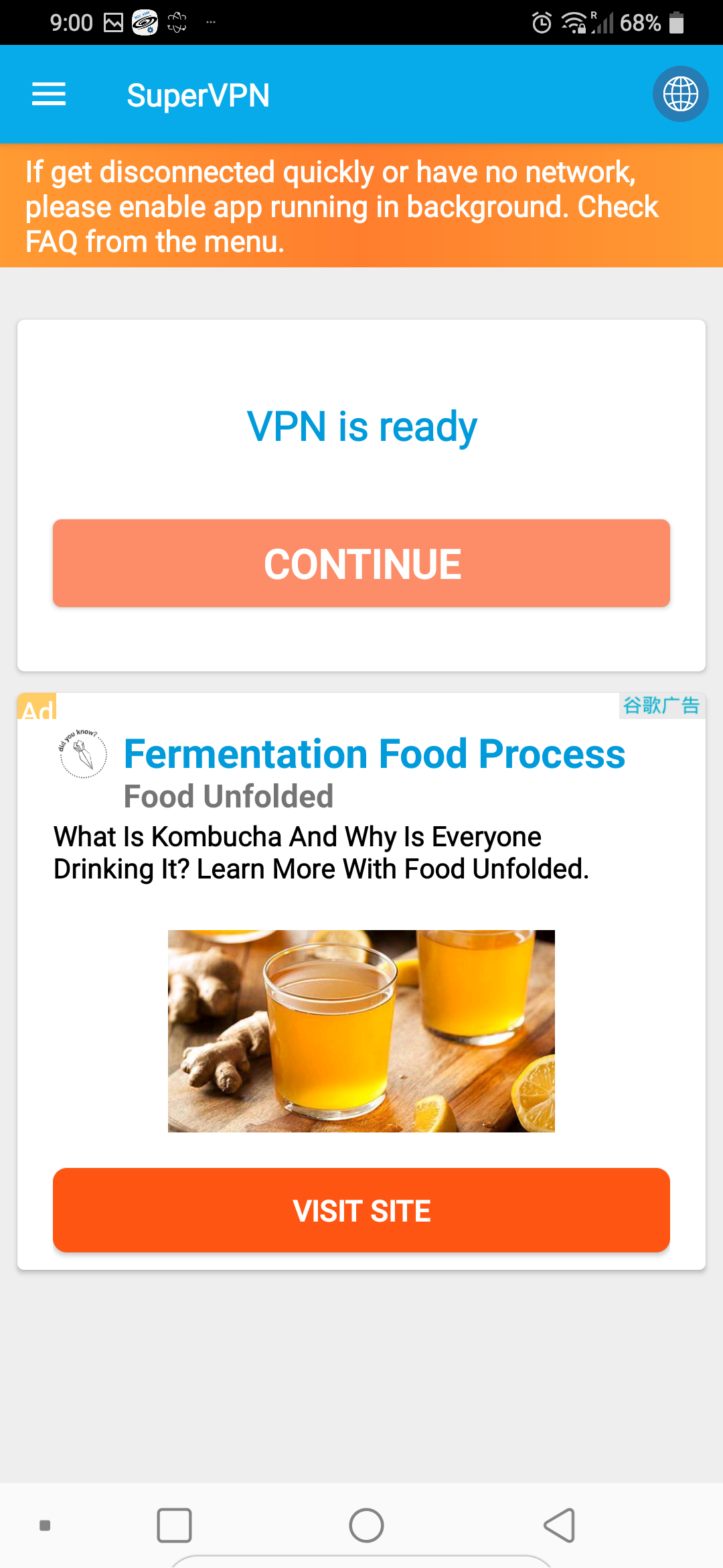 SuperVPN을 실행하면 아래와 같이 VPN is ready라는 화면이 나오는데 밑에 continue를 누른다