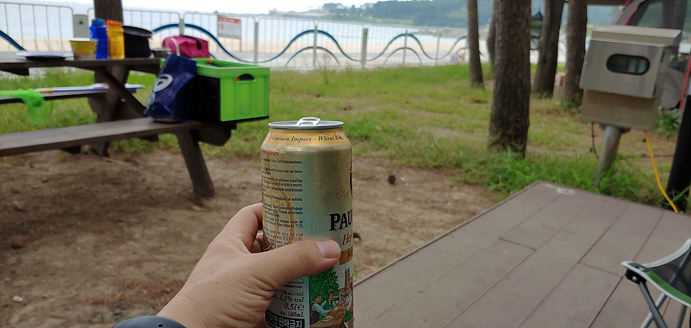 혼자서 40여 분 만에 텐트 설치 끝낸 후 시원한 맥주 한잔~