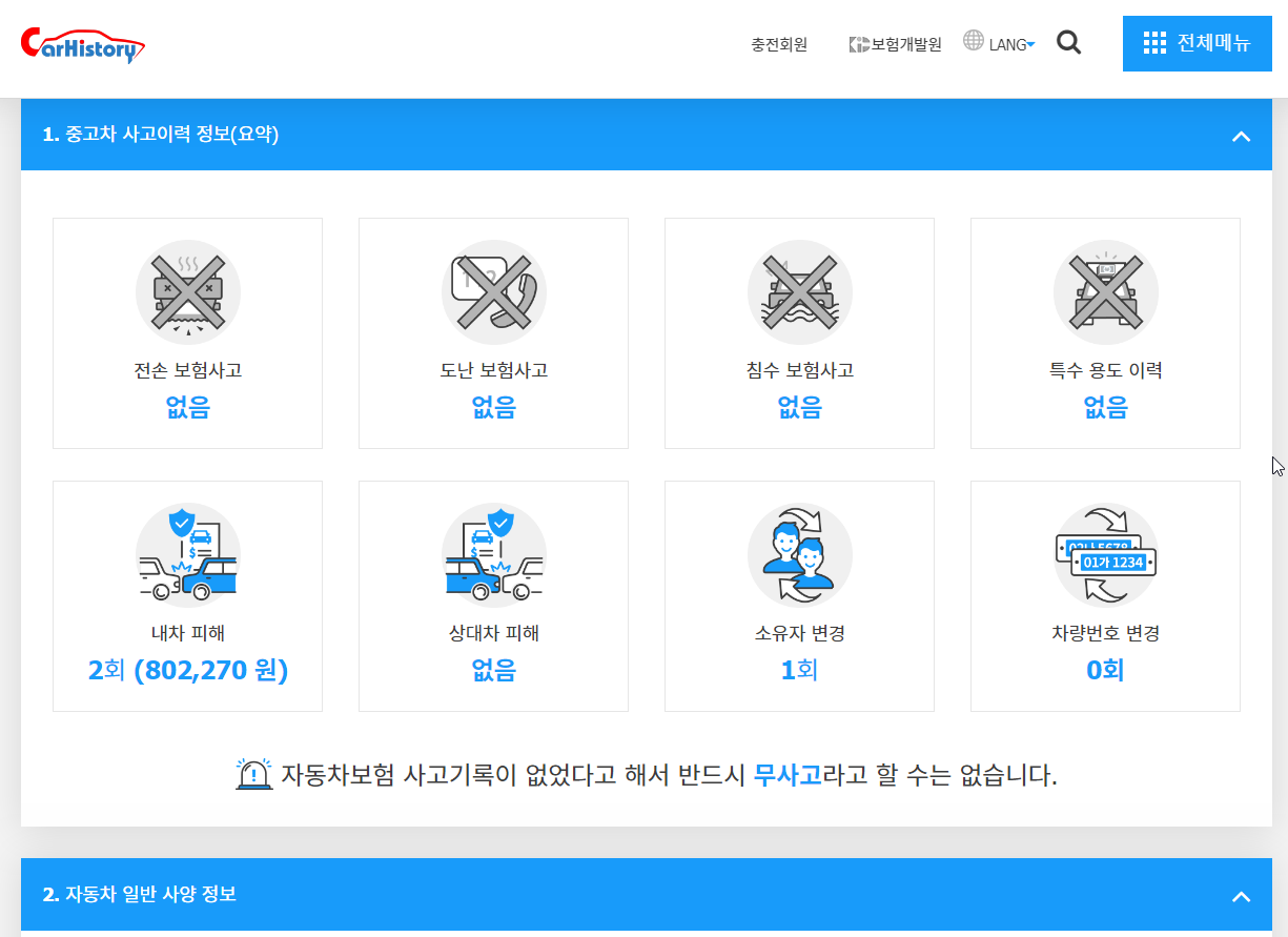 아래와 같이 보험사고나 용도변경(영업용 택시나 렌트카 이력을 알 수 있음), 소요자 변경 횟수 및 차량번호 변경등 정보를 조회할 수 있다.
