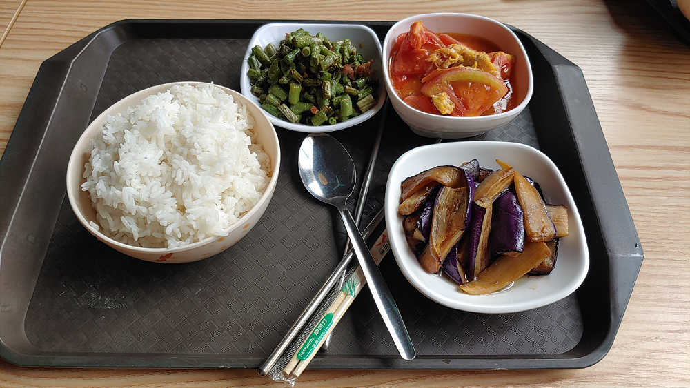 내가 가장 좋아하는 음식이 바로 이렇게 반찬 하나하나를 골라서 먹을 수 있는 방식인데 토마토, 가지, 콩줄기 볶음 이렇게 3가지를 골랐다. 15위안.