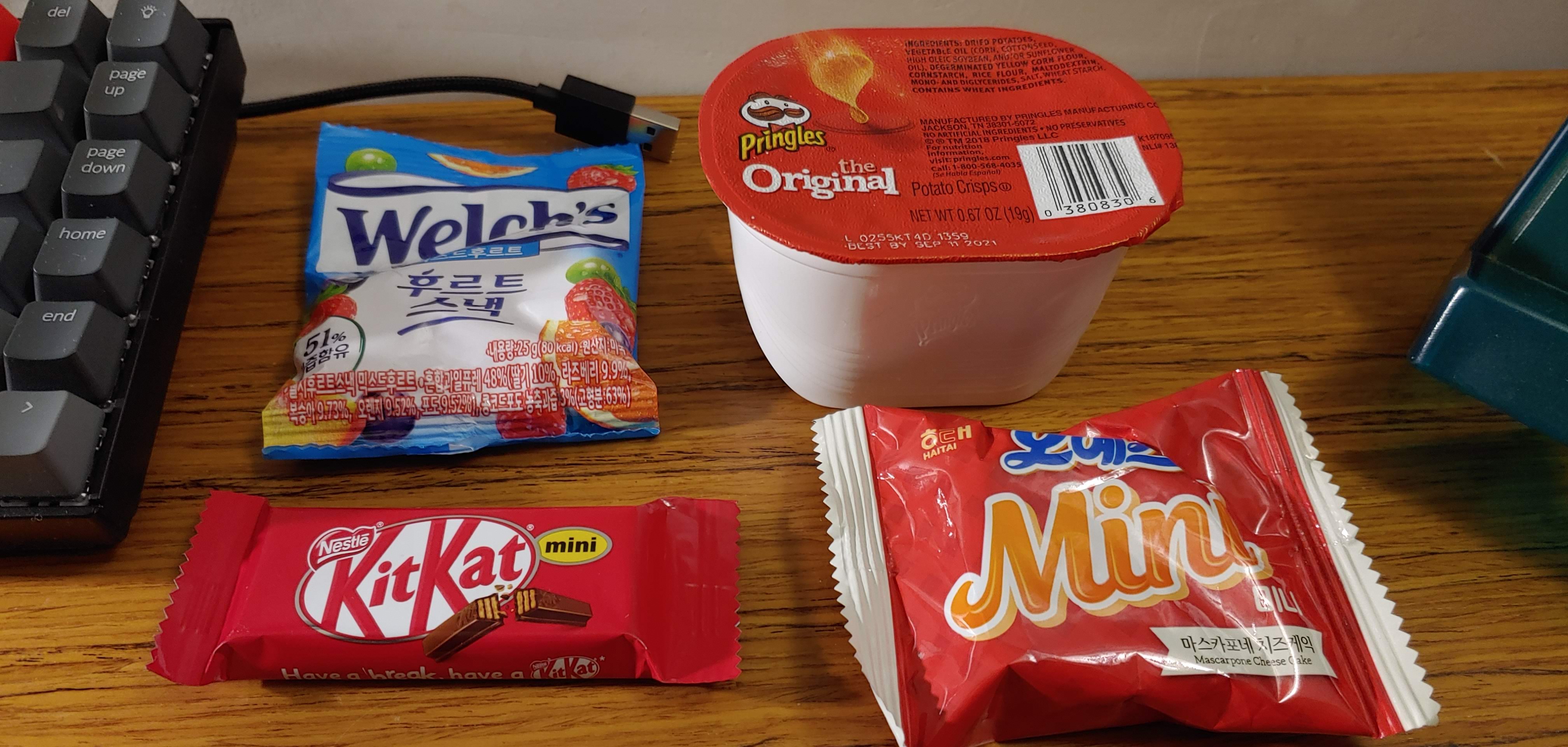 - 다양한 먹거리가 제공된다(생수 4병, 음료수 2캔, 초코파이등 과자 여러가지)