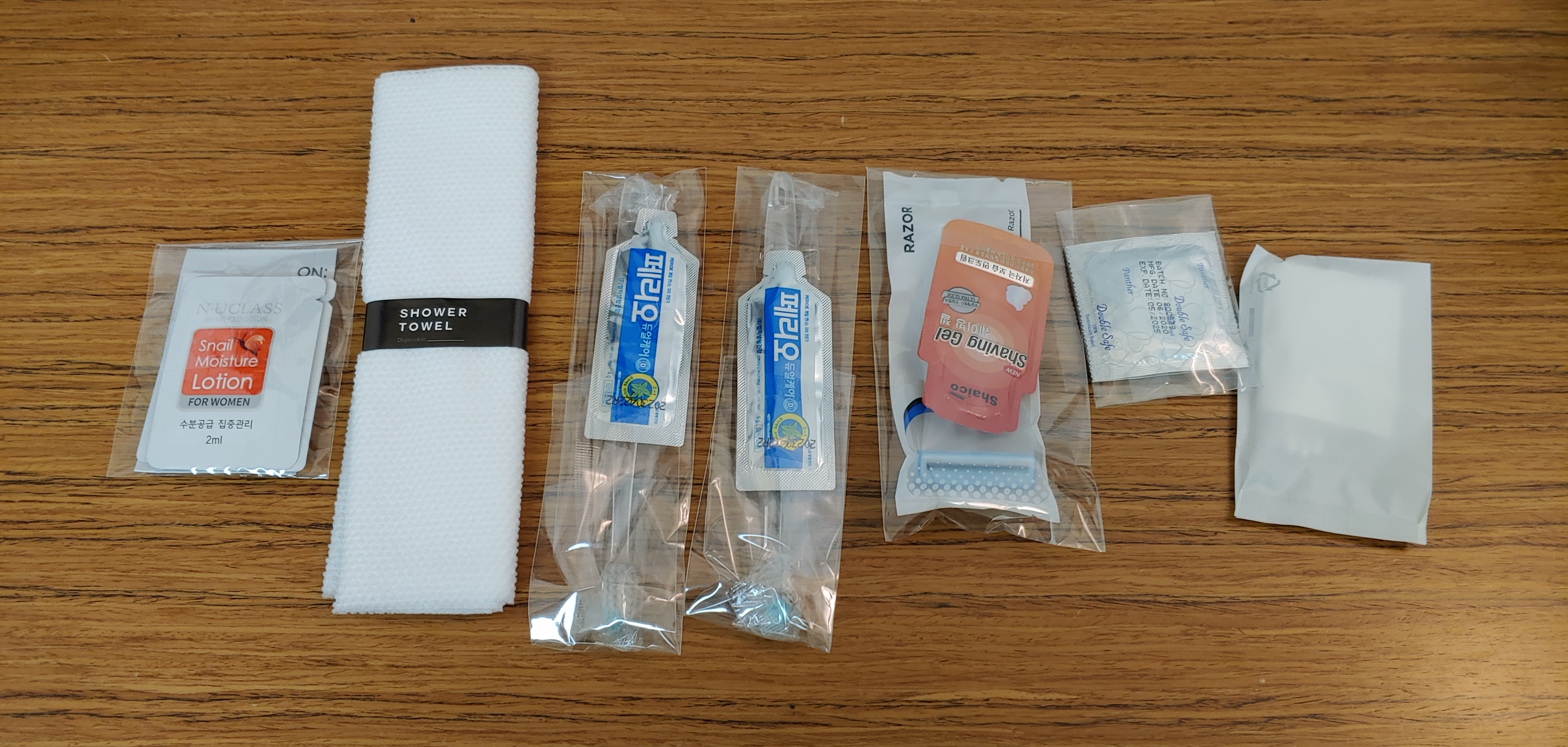 기본제공되는 세면도구들...오른쪽 끝에서 2번째가 모텔에서 주는 물건이다.