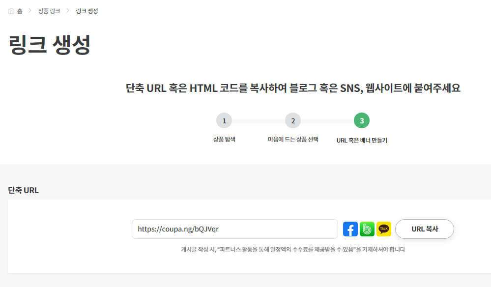 아래는 쿠팡파트너스의 단축 url인데, url복사를 눌러준다..