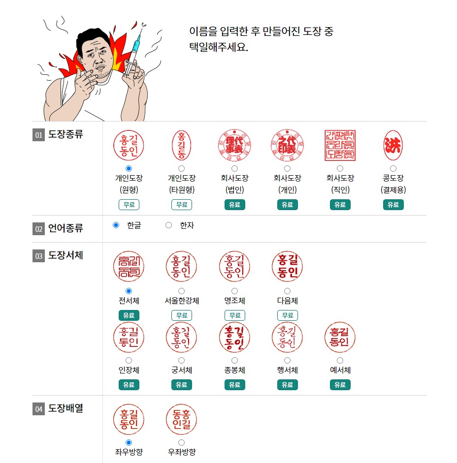 도장종류, 서체등등 마음에 드는 것으로 선택한 후, 이름을 입력하면 바로 도장파일이 만들어진다.