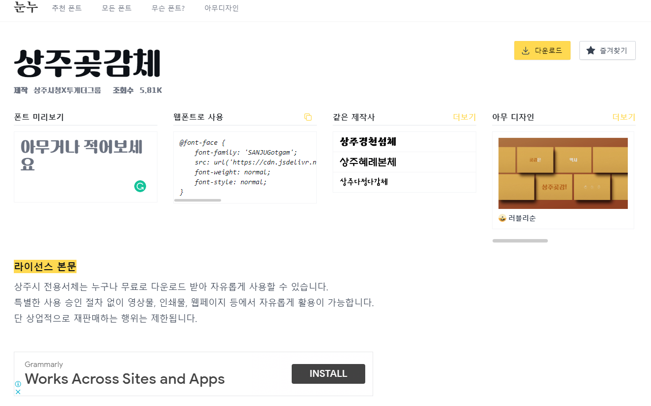 예를 들면 상주곶감체를 클릭해서 다운로드를 클릭하면 상주시홈페이지의 폰트 다운받을 수 있는 곳으로 연결된다.