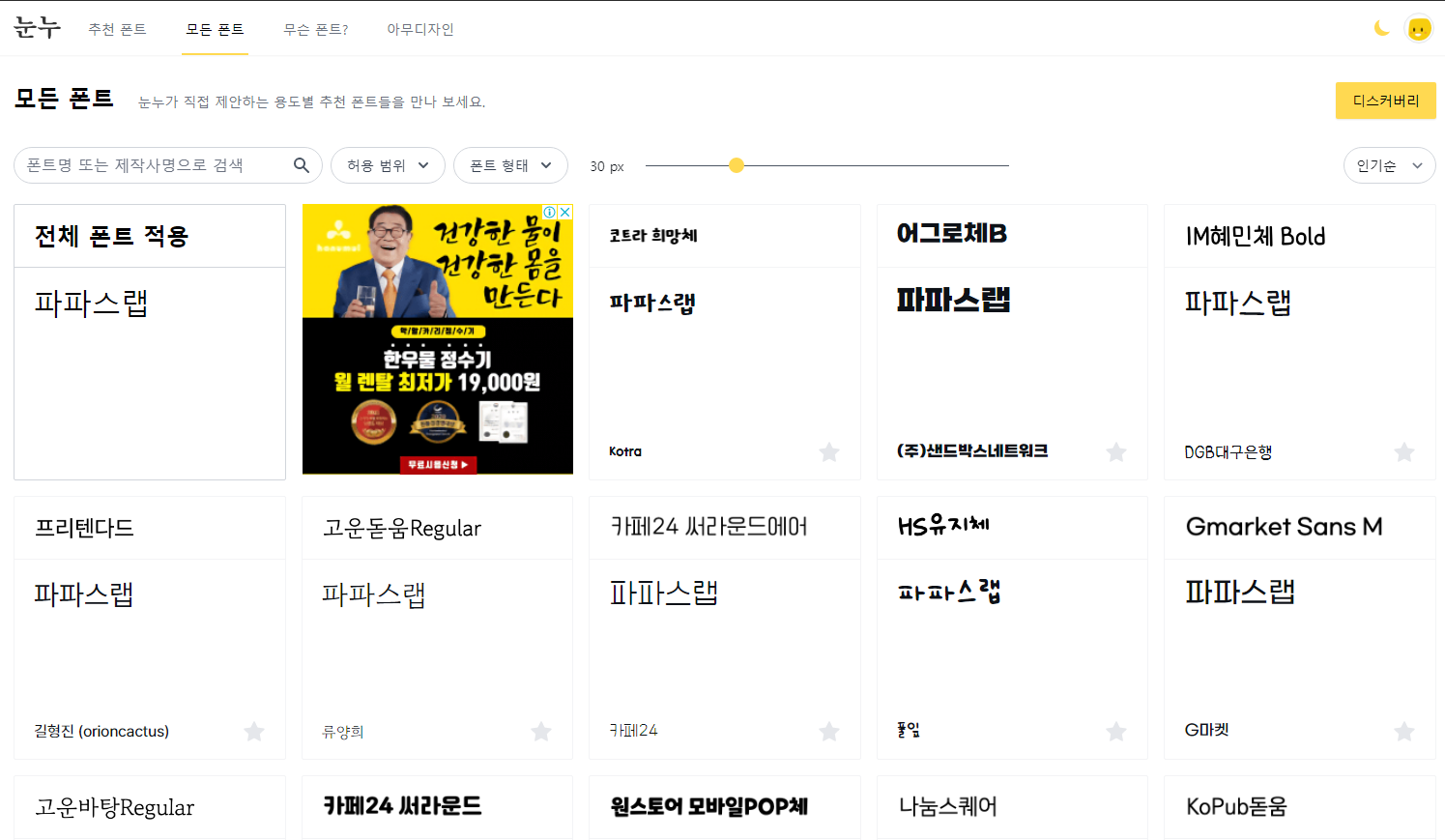 요즘 유행하는 이쁜 한글 폰트체를 쉽게 다운받고 싶을때, 눈누(noonnu.cc)라는 사이트를 가면된다.