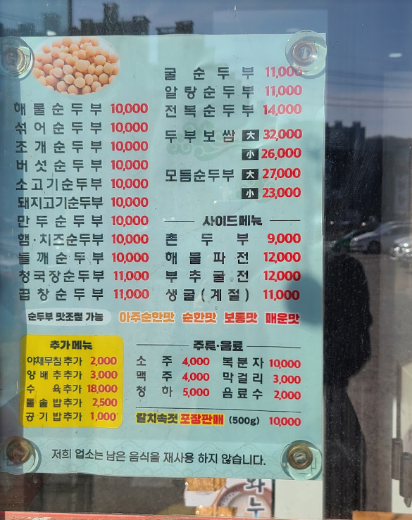 정문 유리창에 있는 메뉴판...물가가 올라도 너무 올랐다..순두부가 1만원...