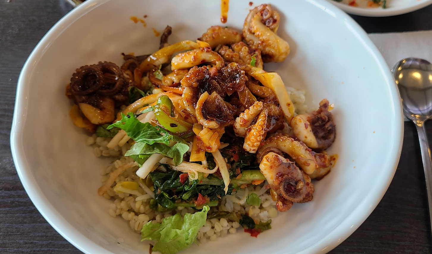 밥위에 쭈꾸미를 올리고 밑반찬과 함께 보리밥에 슥슥 비벼준다.