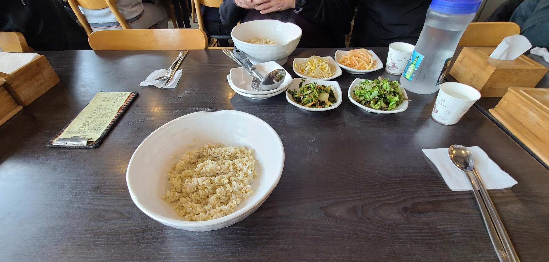 밥위에 쭈꾸미를 올리고 밑반찬과 함께 보리밥에 슥슥 비벼준다.