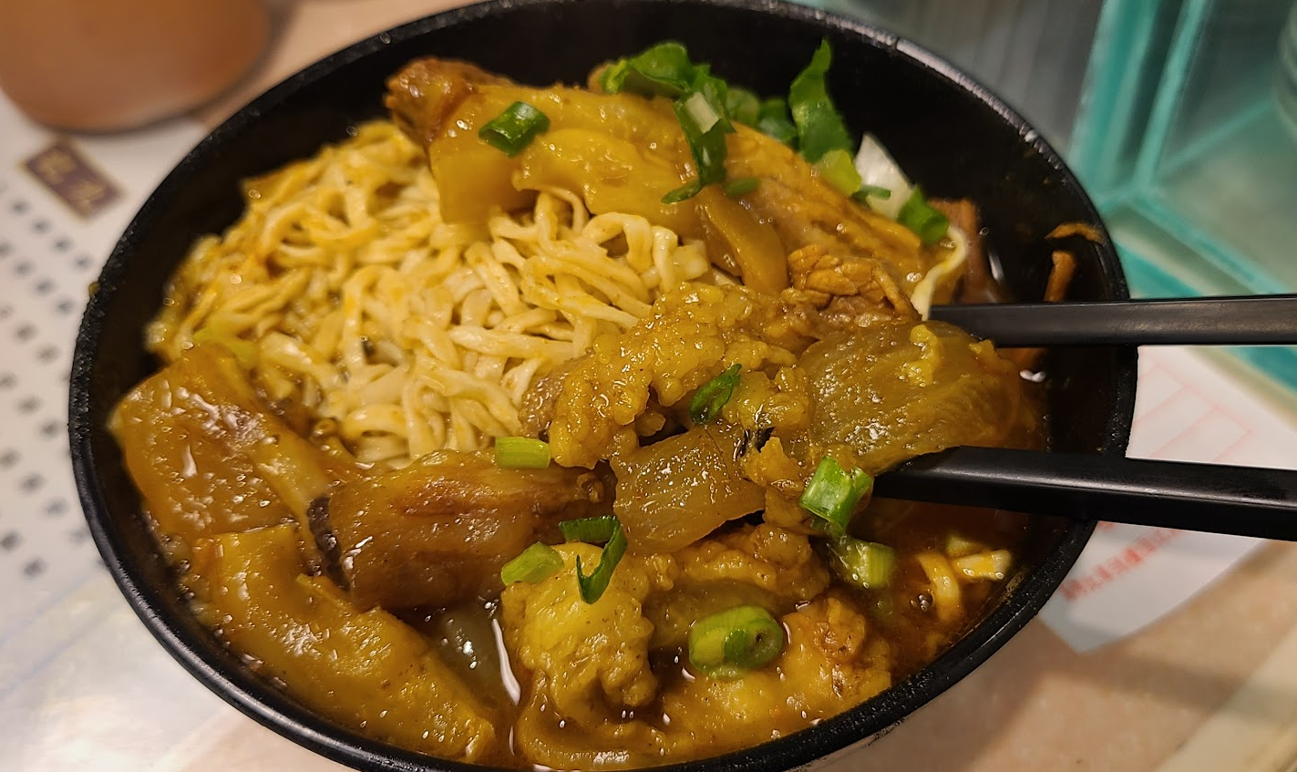 소고기와 도가니라고 하는데 소 힘줄부위를 푹 삶아서 카레에 버무리고 면은 얇은 라면 면발같다.
