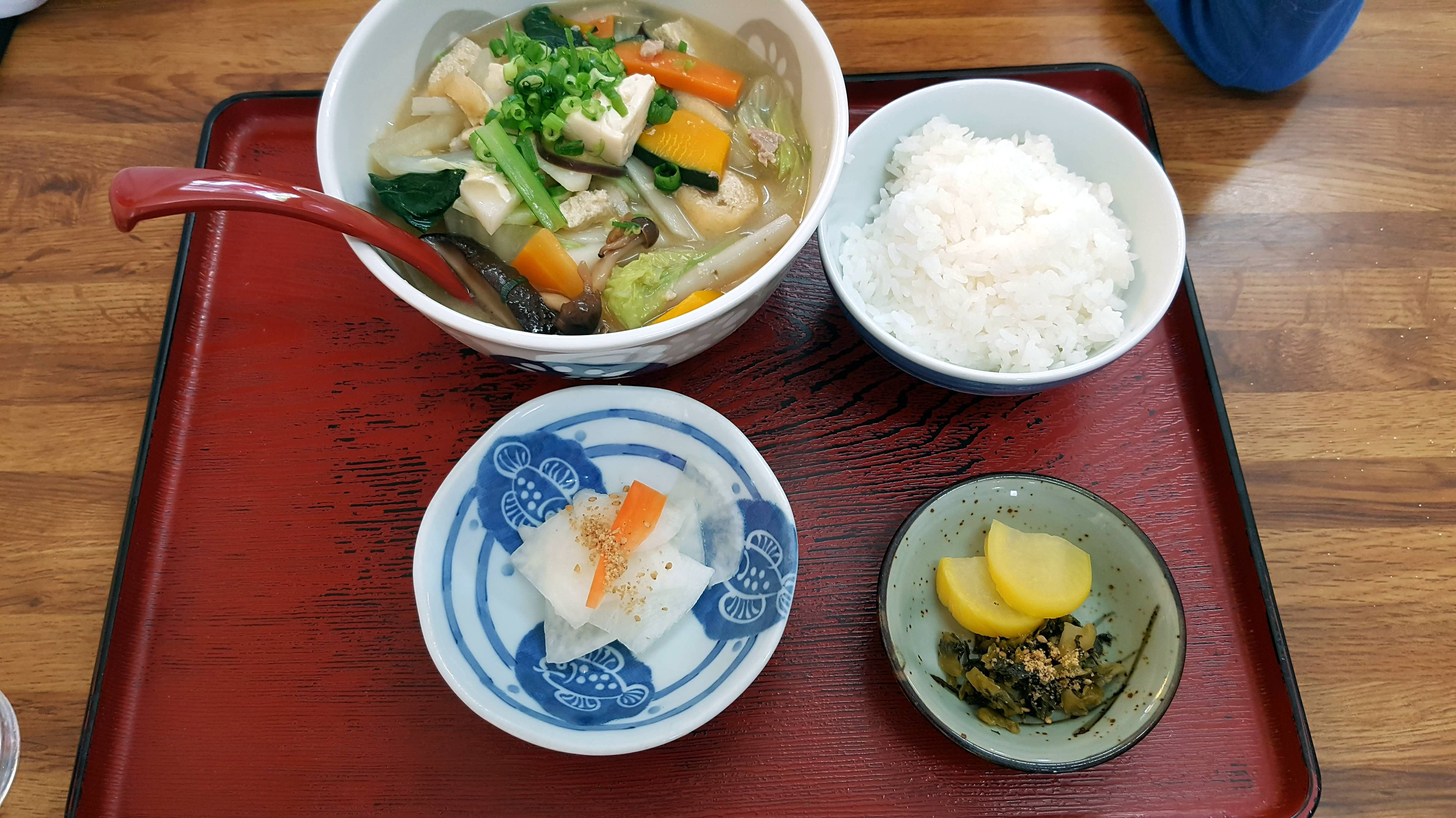 된장을 연하게 풀어서 각종 야채와 면을 넣고 끊인건데 한국사람 입맛에 잘 맞다.(다른 일본 음식 대비)