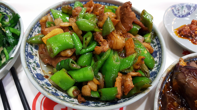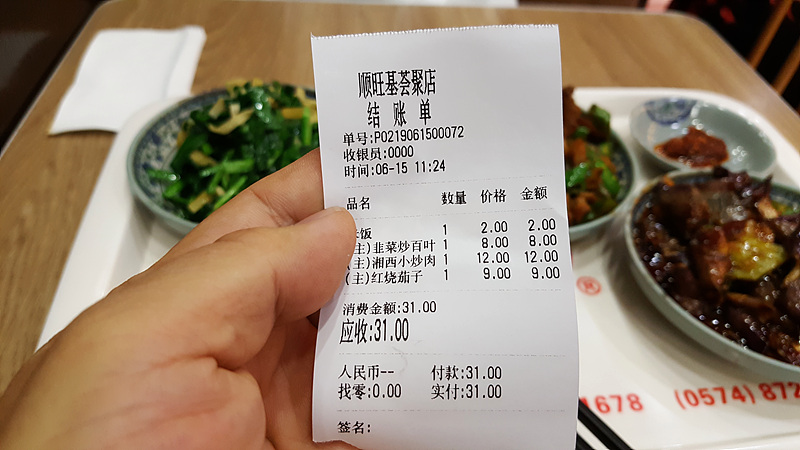 밥은 2위안(330원), 고추돼지고기 뽁음 12위안(2000원), 부추뽁음 8위안(1300원), 가지뽁음 9위안(1500원),