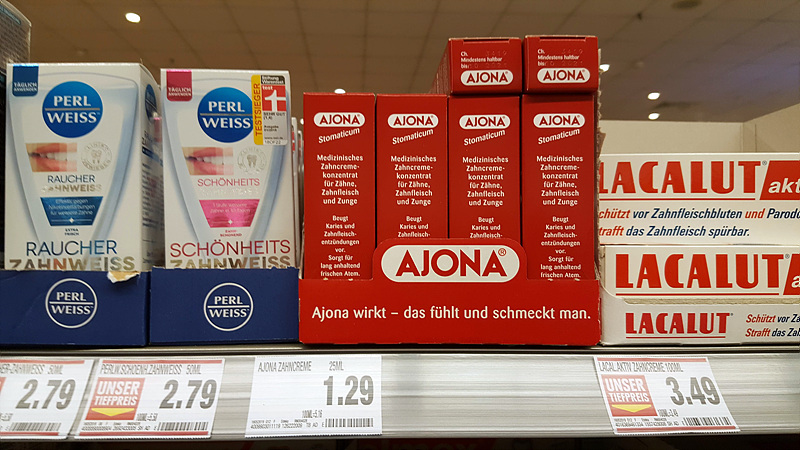 그 유명한 아요나 치약, 에데카에서는 1,29유로, dm에서는 1.25유로에 판다.