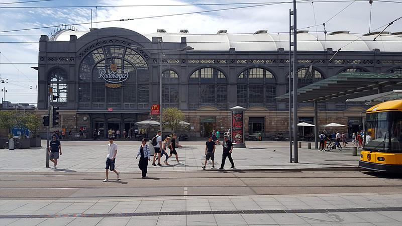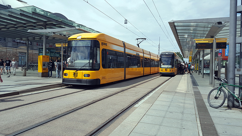 드레스덴의 상징인 노락색 트램 정거장이 역 바로 앞에 있다.