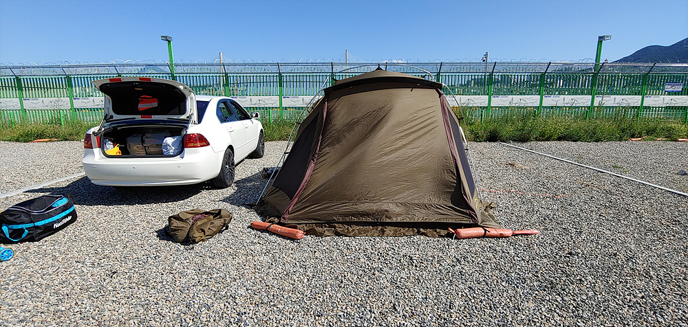 야영장을 둘러싼 펜스, 바로 뒤에 항만 공사를 하고 있고, 주차장에 둘러싸여 일반적인 캠핑과는 분위기가 많이 다른다.