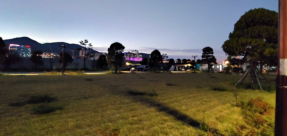 어둠이 내린 저녁, 부산 시내의 불빛이 이쁘게 들어오고 야영장 내에도 가로등이 켜진다.