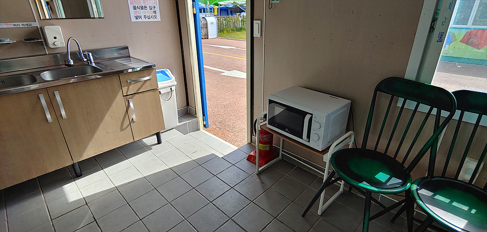 취사장도 깔끔하게 관리되고 있는데 퐁퐁은 구비되어있고(수세미는 없음) 특이하게 전자레인지도 있다.