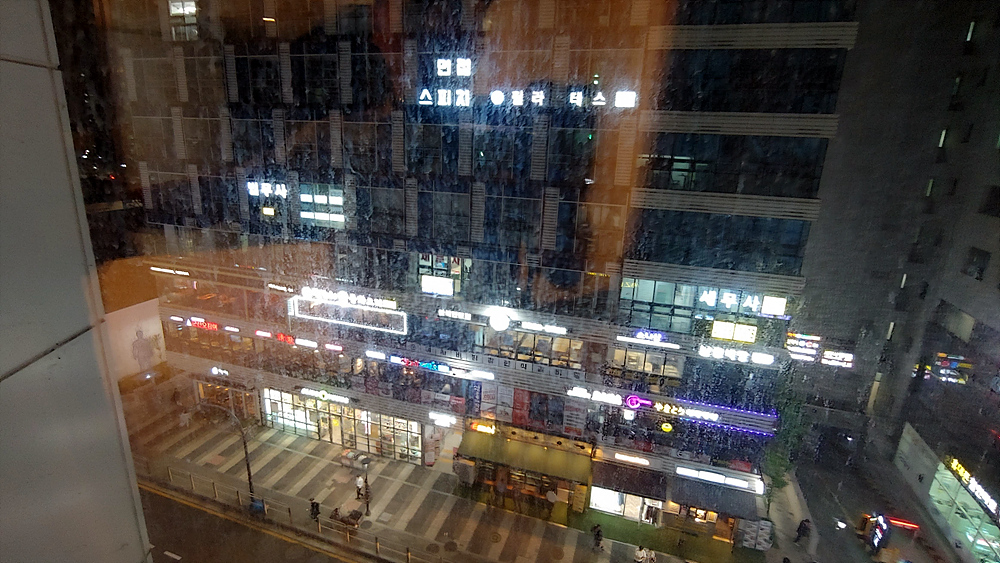 먼지가 가득한 창 밖 너머로 건물만 있다. 창문을 열어 둘 수가 없다.