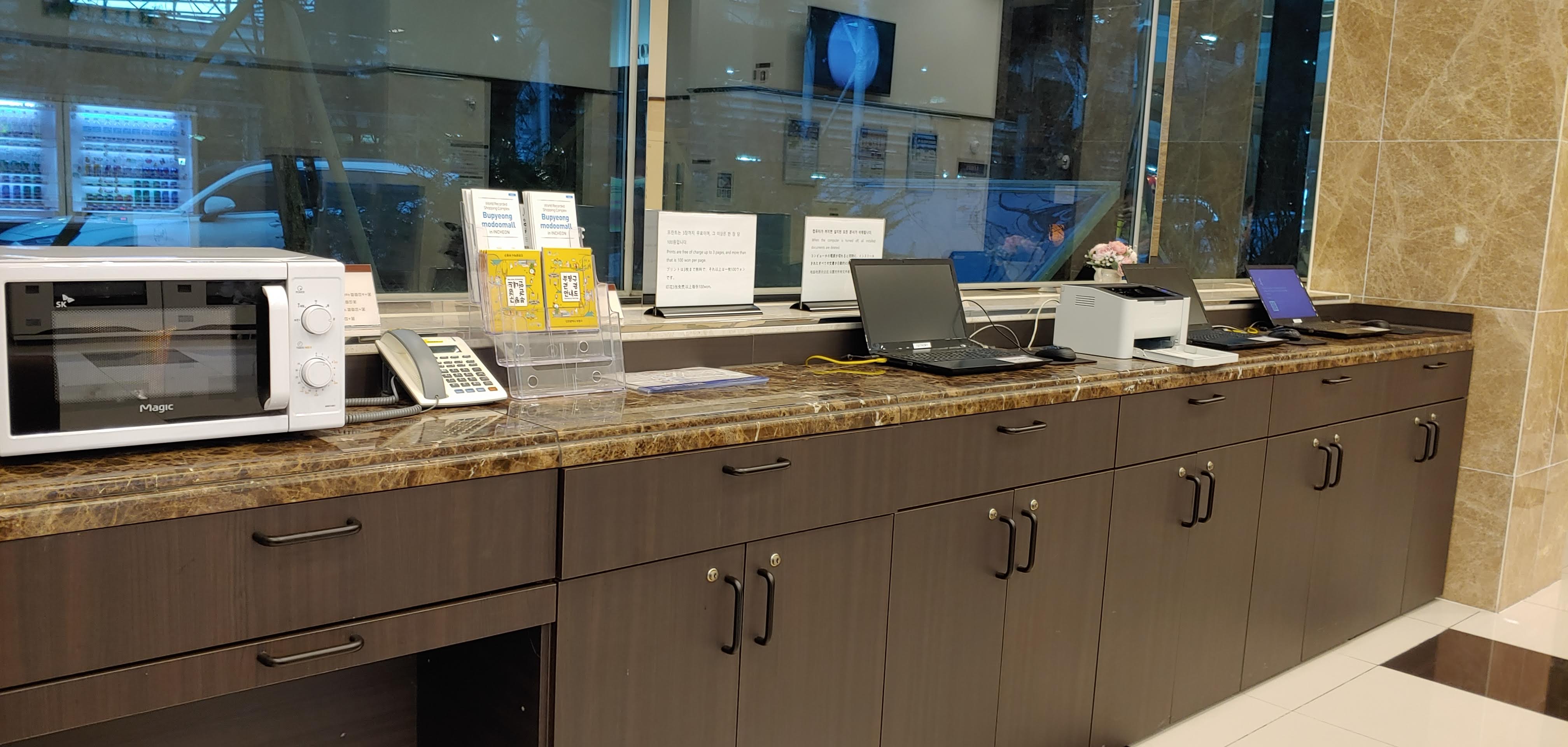 여느 토요코인과 거의 같은 배치인데 1층에 프린터와 연결된 노트북이 있고 전자렌지도 있다.