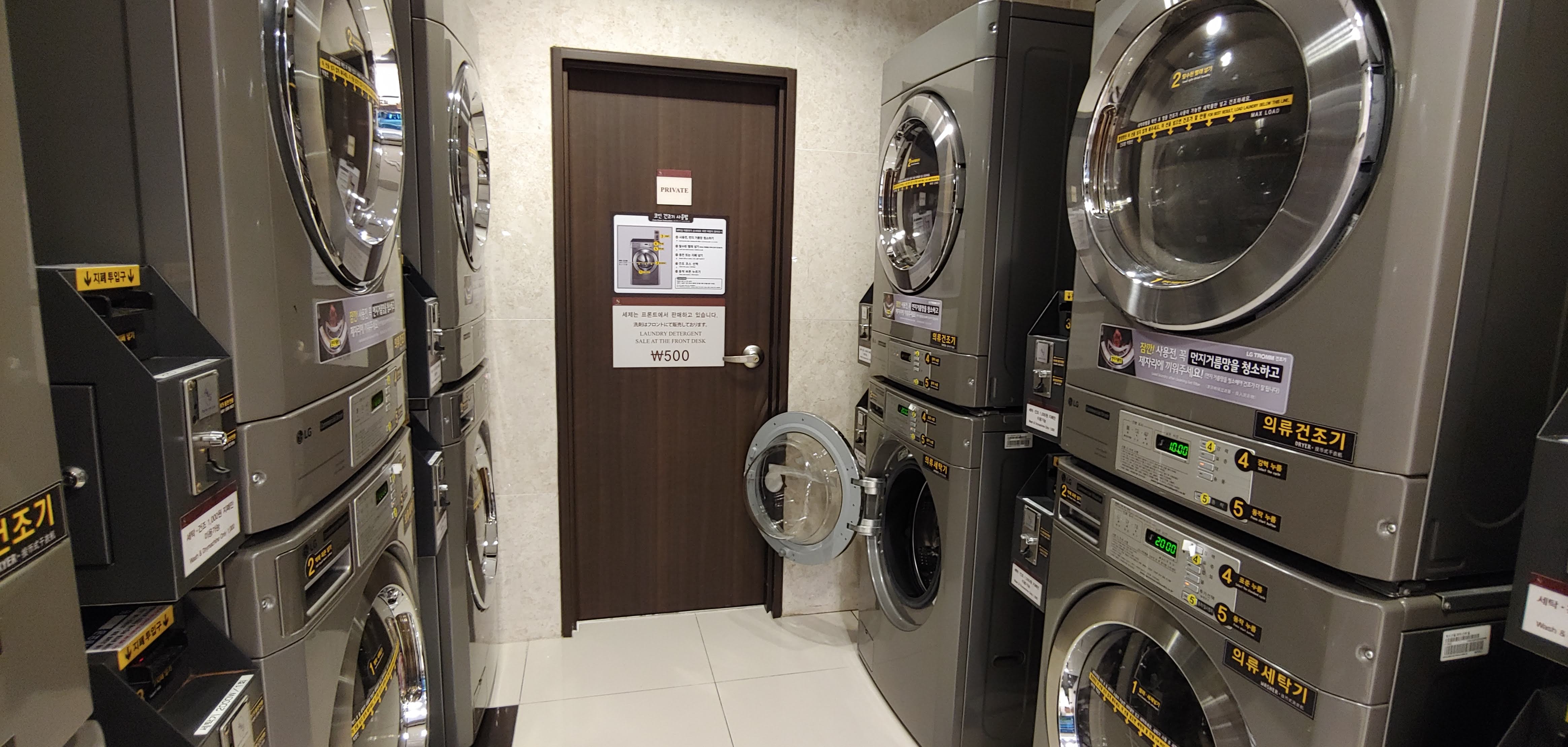잠옷이 비치되어있고 빨래할 수 있는 세탁기와 건조대가 있다.