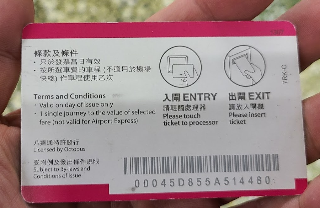 MTR를 이용하기 위해서는 표을 구입해야하는데 1회용표 및 옥토퍼스카드라는 우리나라 티머니 카드와 같은 교통카드 이용하는 것 등 2가지 방법이 있다.
