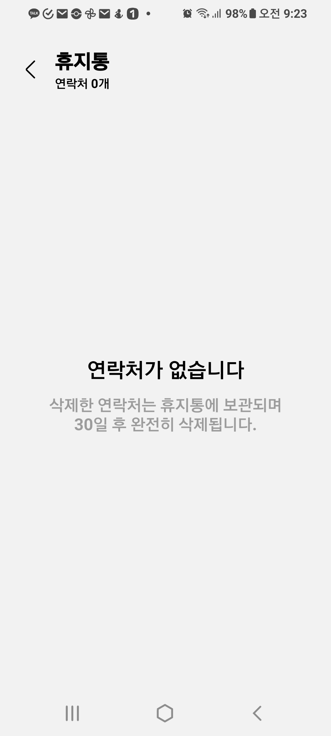 삭제가 된 연락처는 휴지통안에 있고(아래는 복원시킨후라서 아무것도 없음)